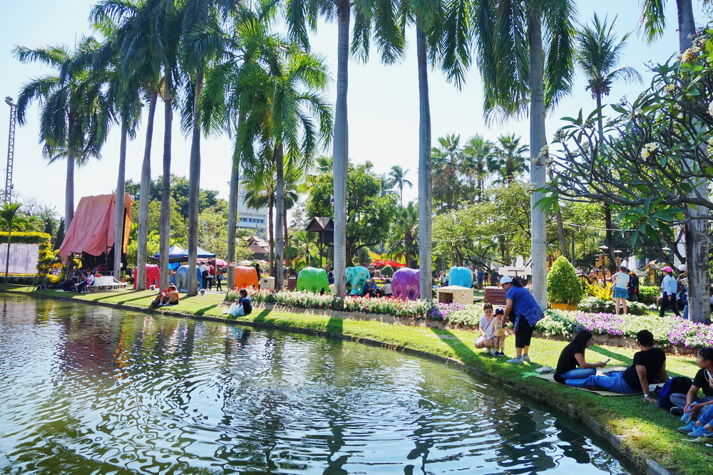 Un étang paisible entouré de palmiers et de fleurs tropicales, Des joggeurs font le tour du parc sur des sentiers ombragés, Les bancs en bois accueillent des lecteurs et des rêveurs, Les lotus flottent à la surface de l’eau, délicats et colorés, Les fontaines jaillissent doucement au centre du bassin, Les papillons volent entre les massifs fleuris, Les statues décoratives ajoutent une touche artistique, Les enfants jouent sur les pelouses, insouciants, Les couples pique-niquent à l’ombre des arbres, Les pigeons picorent près des bancs, Les fleurs de frangipanier tombent doucement sur le sol, Les vélos sont garés près des entrées, Les promeneurs photographient les paysages, Les arbres forment une voûte verte et protectrice, Le parc est une bulle de calme dans la ville animée.