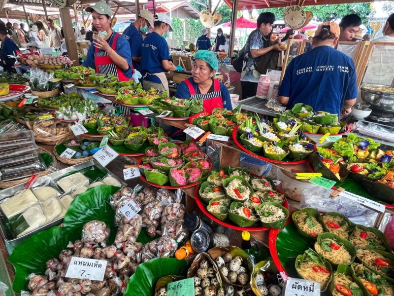 Le durian emplit l’air d’une odeur forte et sucrée. Le gingembre frais pique les narines. Le poisson dégage une senteur marine. Les fleurs de jasmin parfument les allées. Le curry rouge est omniprésent. Le basilic thaï ajoute une note verte. Les mangues mûres diffusent une douceur tropicale. Le café glacé sent le caramel. Les nouilles sautées fument sur les woks. Le piment rouge brûle légèrement l’air. Le savon artisanal sent la lavande. Le cuir des sacs est neuf et tanné. L’encens des boutiques de souvenirs flotte doucement. Le marché est un mélange intense et vivant. Chaque pas révèle une nouvelle senteur.