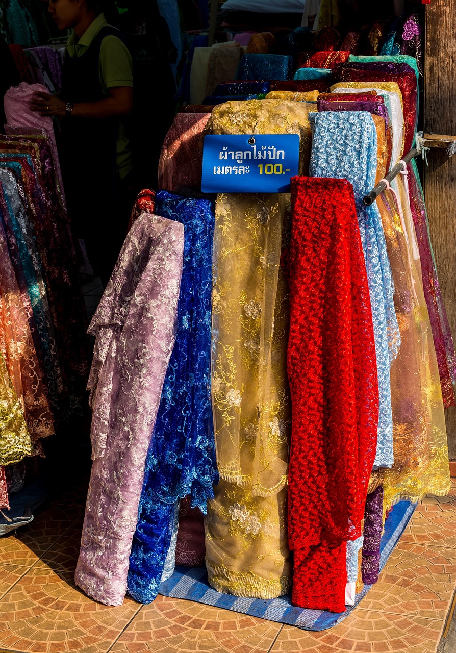 Les étals débordent de fruits tropicaux : mangues, durians, ramboutans. Les vendeurs s’affairent, habillés de tenues colorées. Les sacs de riz s’empilent comme des pyramides. Les lanternes rouges décorent les allées. Les tissus brillants attirent le regard. Les poissons frais scintillent sur la glace. Les paniers en osier sont remplis d’épices. Les touristes prennent des photos, fascinés. Les étals de fleurs ajoutent des touches de rose et de jaune. Les stands de street food fument et crépitent. Les escaliers mènent à l’étage des vêtements. Les néons clignotent au-dessus des boutiques. Les balances pèsent les produits avec précision. Les motos passent lentement entre les allées. Les couleurs explosent dans chaque recoin.