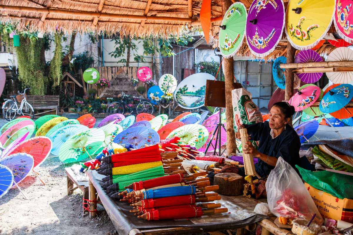 Des ateliers ouverts où les artisans tissent, sculptent et peignent, Des ombrelles colorées suspendues comme des fleurs géantes, Des rouleaux de soie brillent sous la lumière naturelle, Des poteries alignées sur des étagères en bois brut, Des peintres décorent des éventails avec des motifs floraux, Des visiteurs observent, émerveillés, les gestes précis des artisans, Des métiers à tisser en bois occupent les coins des ateliers, Des sculptures de Bouddha en bois ou en pierre sont exposées, Des enfants dessinent sur des carnets, inspirés par les lieux, Des paniers en osier sont empilés dans les cours, Des bijoux en argent scintillent dans les vitrines, Des fresques murales racontent l’histoire de l’artisanat local, Des étals proposent des savons, des carnets, des tissus, Des lanternes en papier décorent les allées, Le centre est un musée vivant de savoir-faire ancestral.
