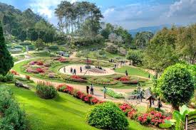 Un jardin botanique luxuriant perché sur les hauteurs de Doi Tung. Des allées fleuries, des orchidées suspendues, des sculptures végétales. Des fontaines et des bassins reflètent les nuages. Des papillons virevoltent entre les massifs. Chaque recoin est une explosion de couleurs : rouges, violets, jaunes. Des pavillons en bois offrent des points de vue sur les montagnes. Le paysage est soigneusement dessiné. C’est une œuvre vivante.
