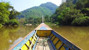 Une rivière sinueuse bordée de jungle, de villages et de montagnes. Des pirogues glissent sur l’eau. Des enfants jouent sur les berges. Des buffles se baignent. Le ciel se reflète dans l’eau calme. Des ponts suspendus relient les rives. Des pêcheurs lancent leurs filets. C’est une scène vivante, authentique. Les couleurs sont douces : verts, bruns, bleus.